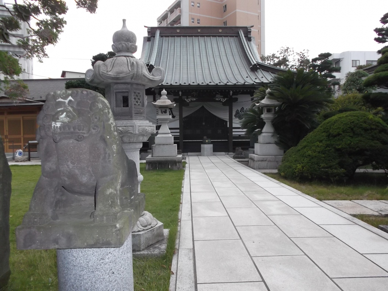 境内には緑の芝生が敷かれ本堂の白壁に鐘のデザインが浮いており(表現適切でないが)、なんとも美しい。ただ、本堂背景にマンションが聳え建ってる・この光景は駅前開発で今風ですね。