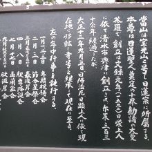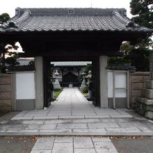 道路沿いにお釈迦様座像と開祖像が安置され、塀の向うにお墓が見えます。奥まったところに寺柱・山門があります。