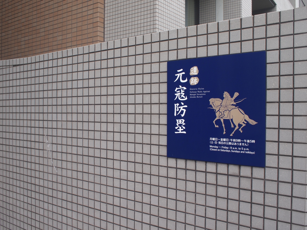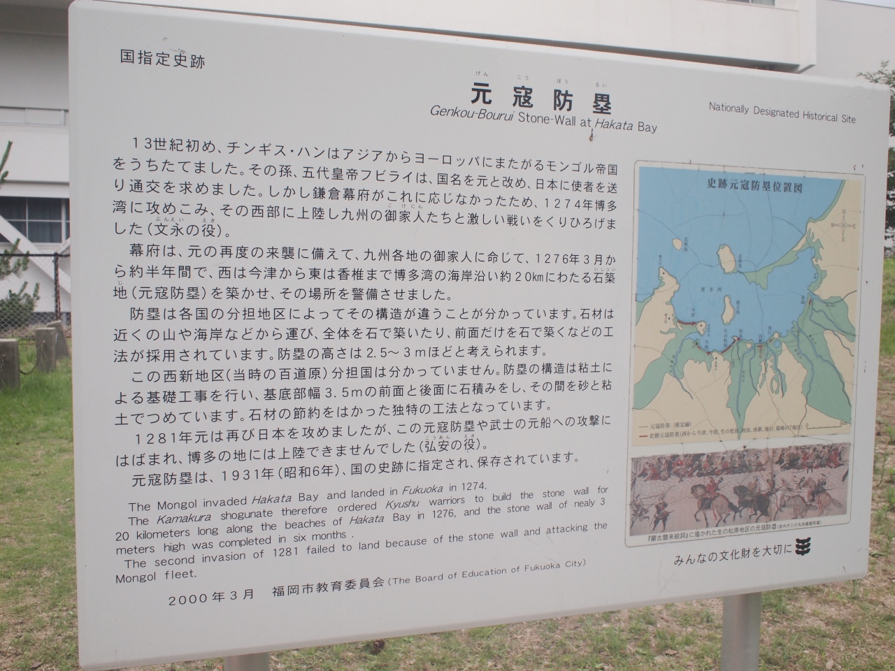 西南学院大学周辺に、元寇防塁が2つありました。大学のすぐ側には土中から2mほどの石で出来た壁が復元されていて、近くには元寇神社もありました。大学構内にもあるようです。もう少し離れたところにもありましたが、ここは痕跡のような感じでした。でもこれはこれで味があってよかったです。