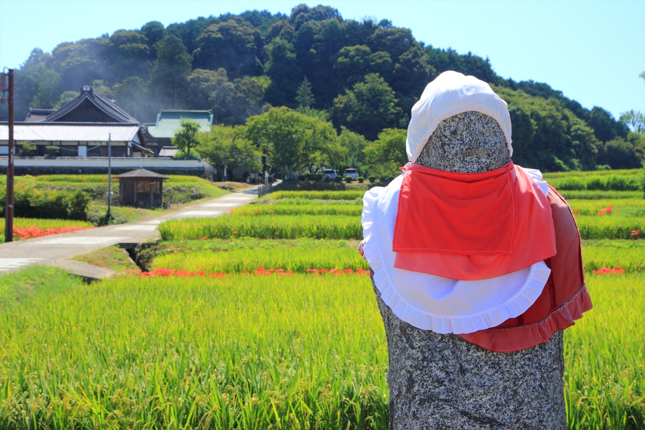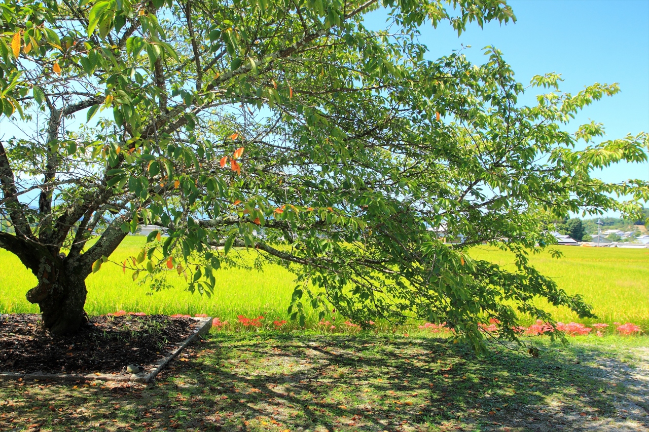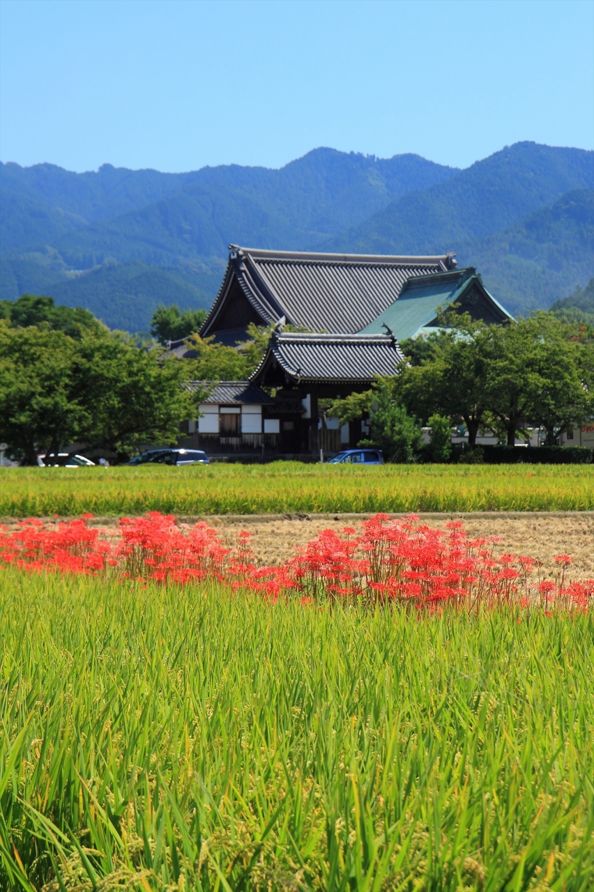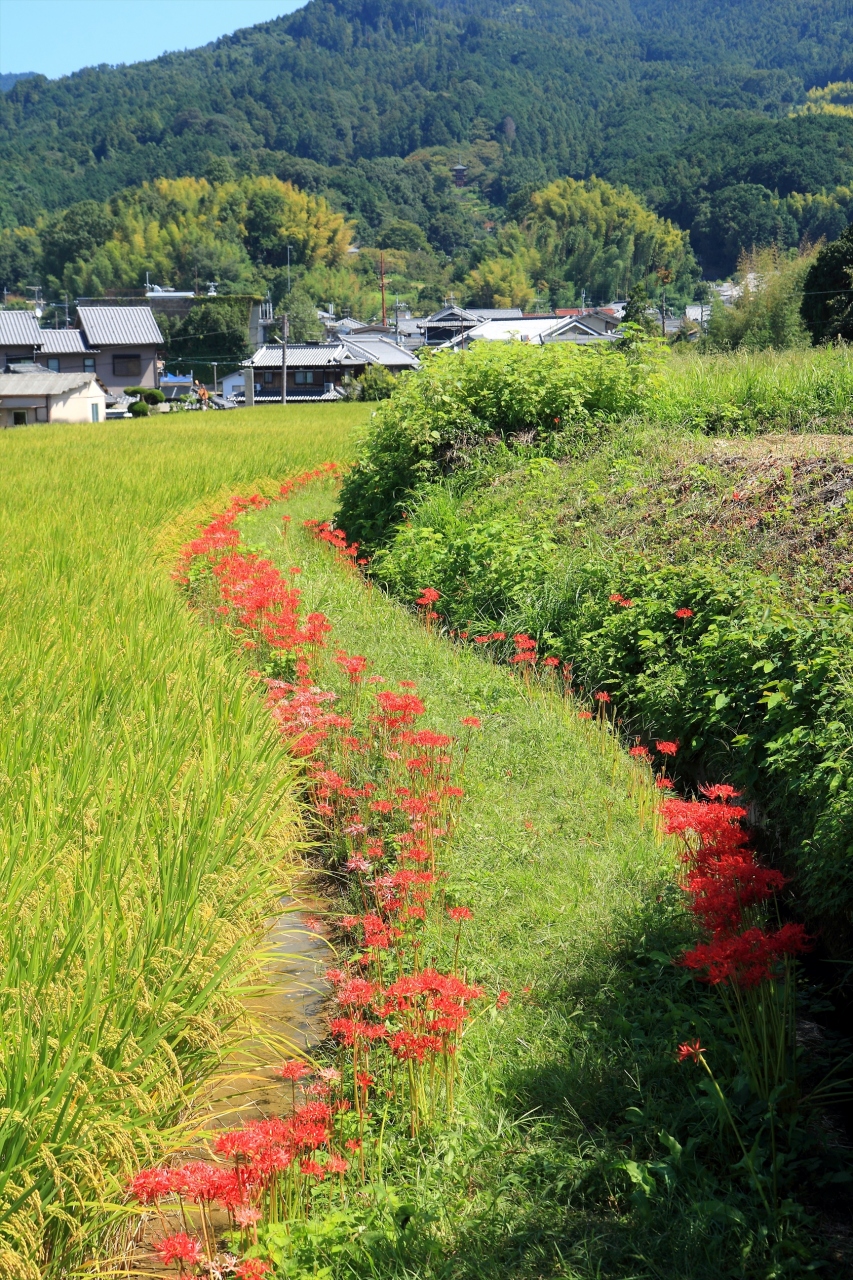 秋には周囲の田んぼの畦道に彼岸花が咲き,赤いラインを作ります。