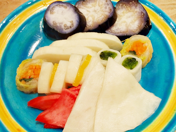季節の漬物とご飯、お味噌汁、宇治茶がセットになっていて、ご飯はお代わりができました。