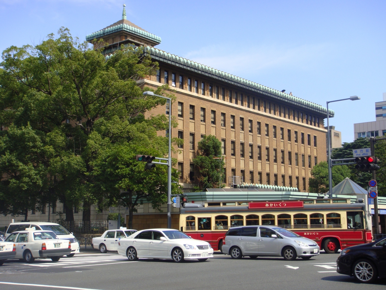 神奈川県庁舎の高さ49メートルの塔屋は横浜三塔の「キングの塔」として親しまれています。また歴史的建造物として、1996年に登録有形文化財(建造物)に登録されています。塔屋は日本の城の天守閣の様になっているのが特徴で、「帝冠様式」というのだそうです。