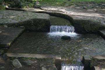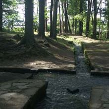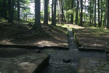 甲斐小泉駅から線路沿いに小淵沢駅の方向に5分ぐらい歩くと、森の中に三分一湧水がありました。崖の下から湧く八ヶ岳の伏流水が、三方向に分かれて下流の各村に均等に配分されています。近くには、三分一湧水を形どった児童公園がありました。