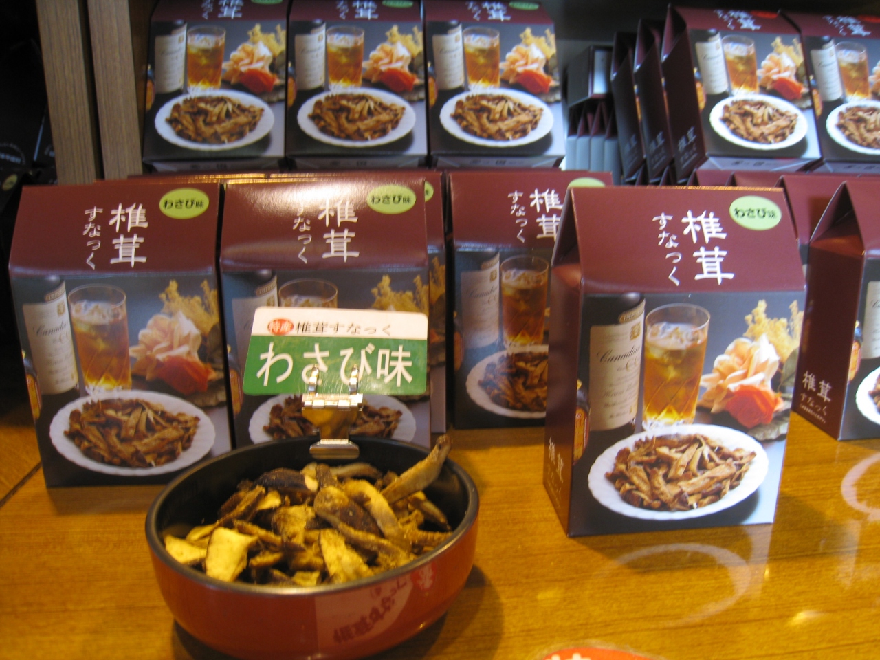 しいたけスナックの試食がたくさんあり、どれもおいしいです。