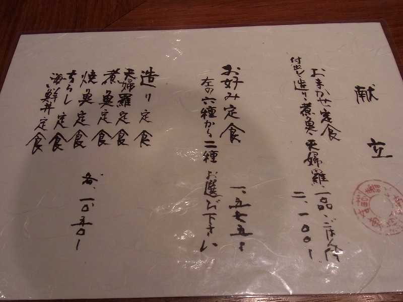 ランチは、どのお魚を食べるかとその料理方法を指定します。たとえば、「金目鯛」の「煮魚」、「真鯛」の「焼き魚」など。