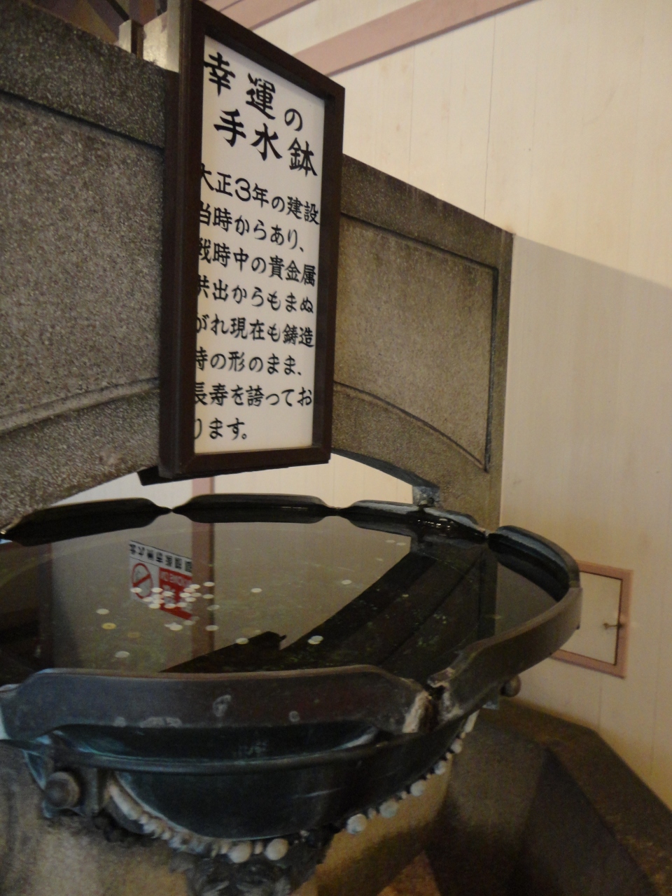 レトロな雰囲気が素敵な門司港駅の中で見つけたのですが、お手洗い自体がとても歴史を感じるものでそこにあったこのは手水鉢戦時中の貴金属の供出からどうにか免れたことから幸運の手水鉢と呼ばれるようになったようです。鉢の風合いがとても素敵で水面が美しく見えます。