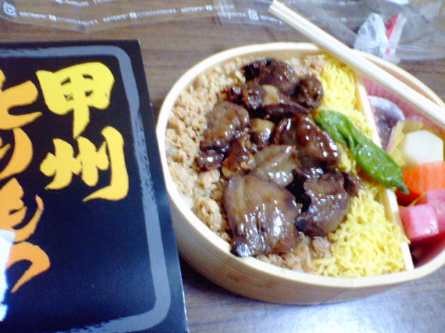 この時は迷った挙句、「甲州とりもつ弁当」を買いました。鳥モツ肉に玉子そぼろと鳥そぼろが組み合わさり、モツなので好みの分かれる所ですが、好きな人にはたまらない一品と思います。