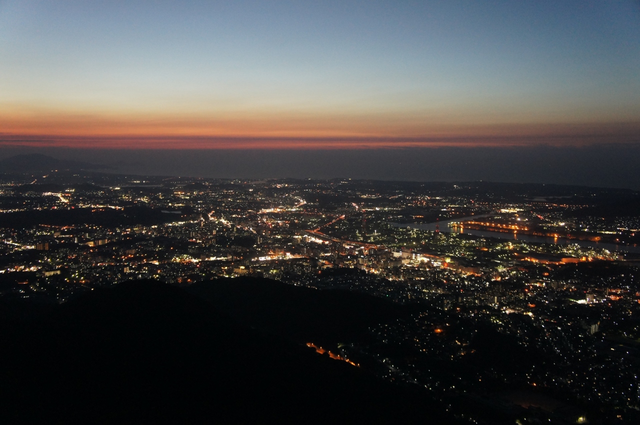 皿倉山は、新日本三大夜景の一つ。最近急に人気が出てきたようで、黒崎駅からシャトルバスで訪ねました。ちょうど、夕陽がきれいに見えだす時間から、暗くなるまで。東西に市街が長く伸びて、その中央に黒く洞海湾が切れ込んでいます。長崎湾を囲む長崎の夜景にちょっと似ていなくもないと思いましたが、光の範囲が広いので、こちらの方が見応えがあるかもしれません。