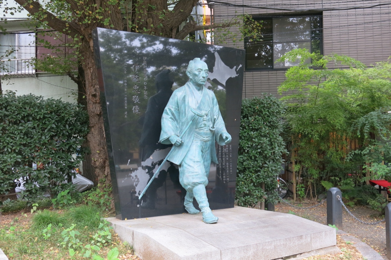 門前仲町にある富岡八幡宮の境内、鳥居をくぐるとすぐに大きな銅像に出会えます。これが江戸時代に日本各地を測量し、日本地図を作ったことで有名な伊能忠敬の像です。
