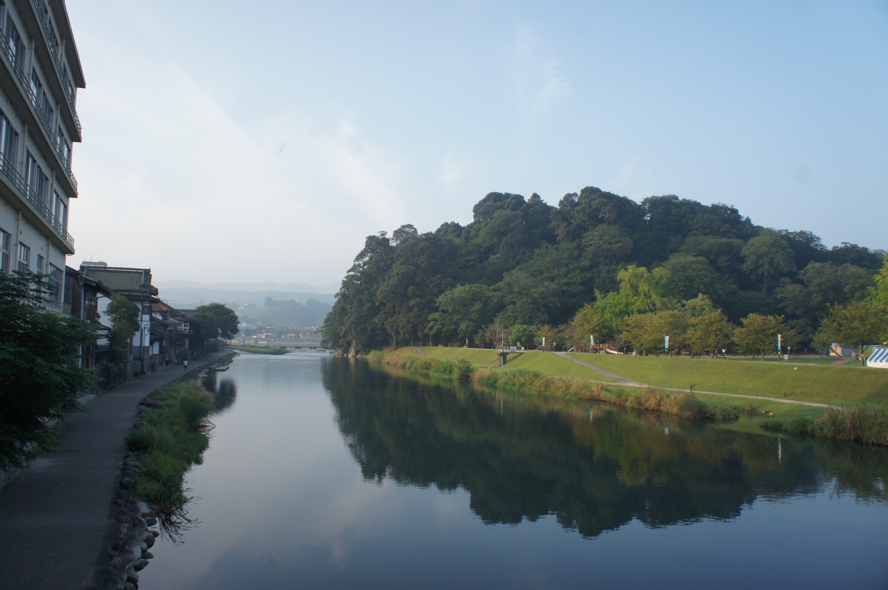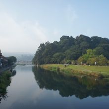 三隈川の中に浮かぶようにこんもりと木の繁った丘陵