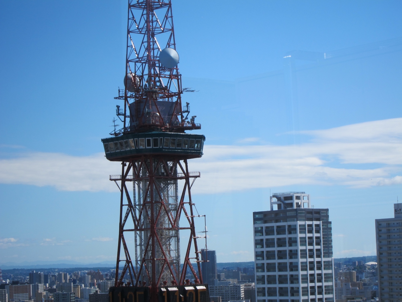 展望は南側の方が面白いと思います。目の前のテレビ塔と双璧をなすような感じですが、テレビ塔の展望台よりは少し低いのが分かります。真下に大通公園の東側の部分が見え、観光客や通行人が小さく見えます。奥には市街地が広がっており、建物の間にススキノの観覧車(ノルベサ)、銀色に輝く札幌ドームや奥には藻岩山、そして遠方には特異な山容の恵庭岳なども見えています。