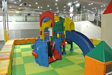 搭乗口を通過した後にキッズスペースがあり、靴を脱いで遊べるスペースがあり滑り台がついているプラスチックでできた遊具があります。
