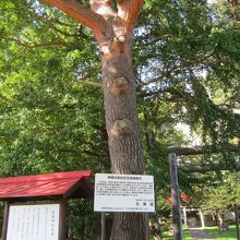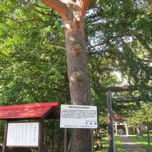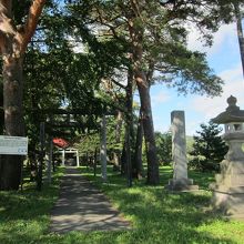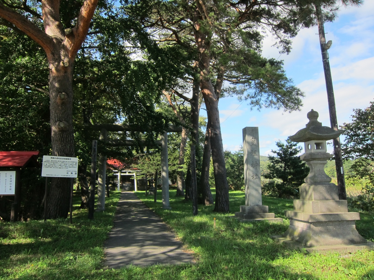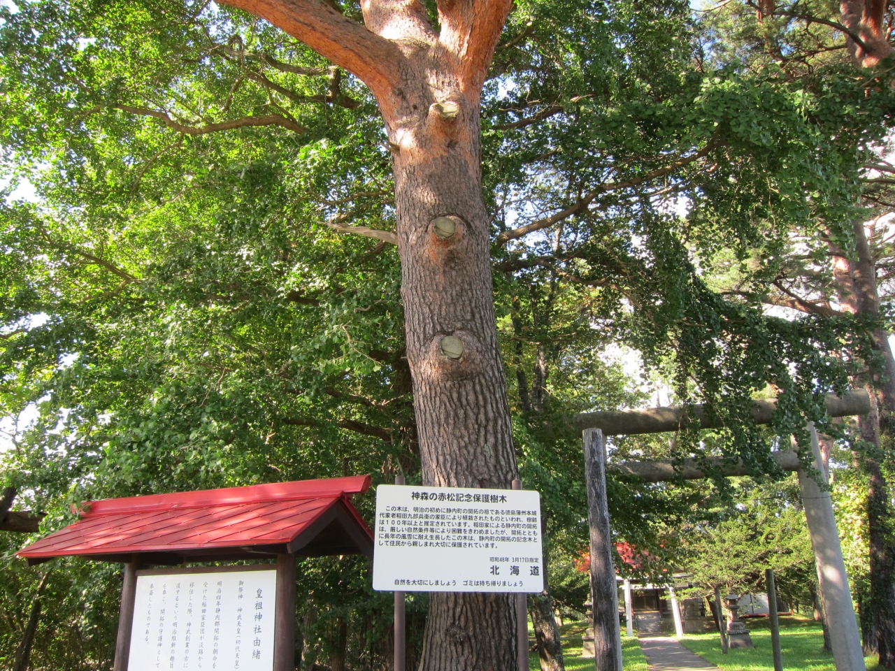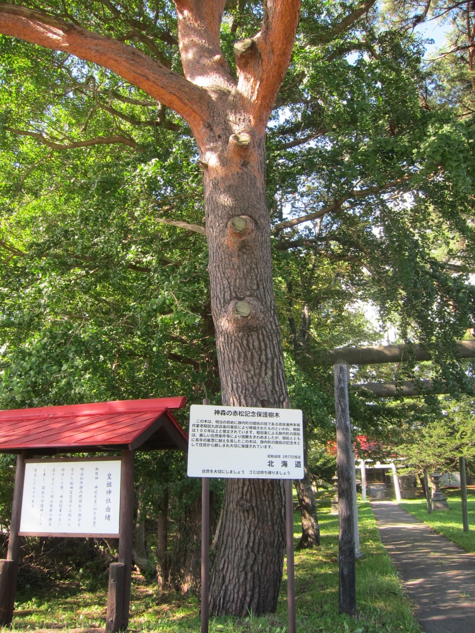 樹皮が剥がれかけ、赤い樹肌をところどころ現した大きな赤松が神社(皇祖神社)の森の入口に立っています。静内の中心部から道道71号線を3kmほど。小河川の日高目名川を渡るところにあります。川や神社の森はあまり目立たないので、近くの道路脇のセイコーマートが目印となります。