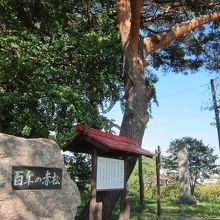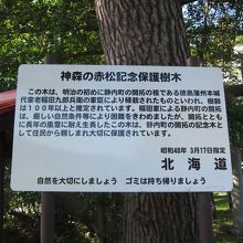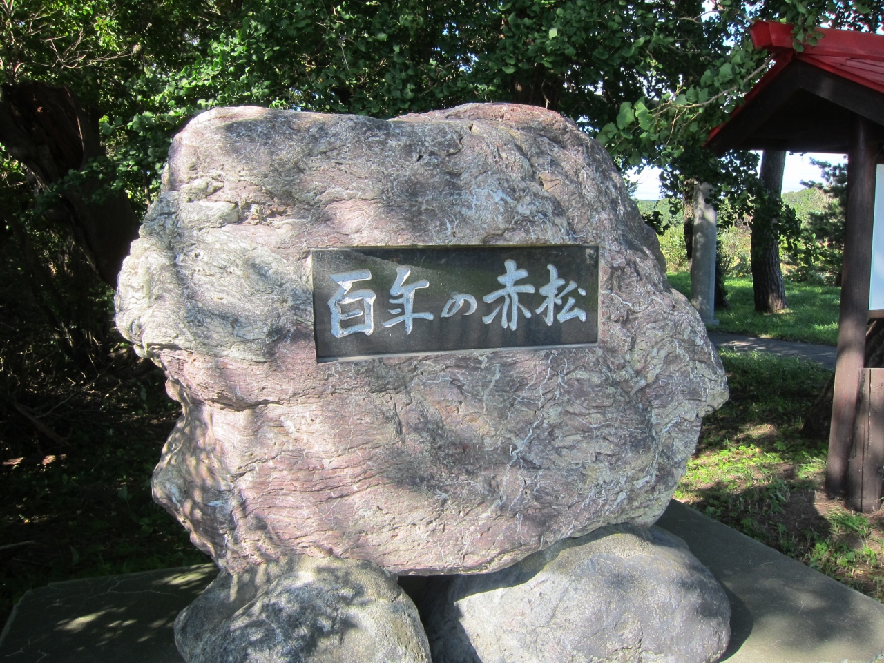 松は明治初期に静内を開拓した稲田氏やその開拓団の人達が植えたそうです。稲田氏の一族の者が、淡路島から移住する際、途中、青森のあたりで赤松の種を入手し、静内の道路沿いなど各所に植えたとの話しがあります。あるときは故郷から遠く離れた北の地での開拓の労苦に耐える拠りどころになったのかもしれません。100年以上の風雪に耐えてきた樹皮は、一部は剥がれ落ち、赤い樹皮をさらしているものの、木は大きく育っています。