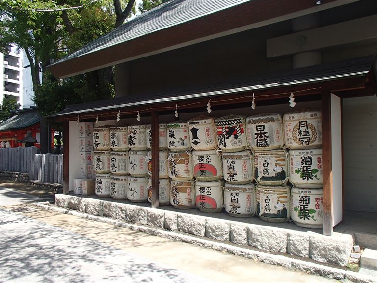 日本酒の樽が奉納されていて、兵庫の灘で、有名処の菊正宗や白鶴、白鹿等、もちろんの事、様々な有名処のお酒の樽がおいてあって、デザイン性豊かな模様を見る事ができます