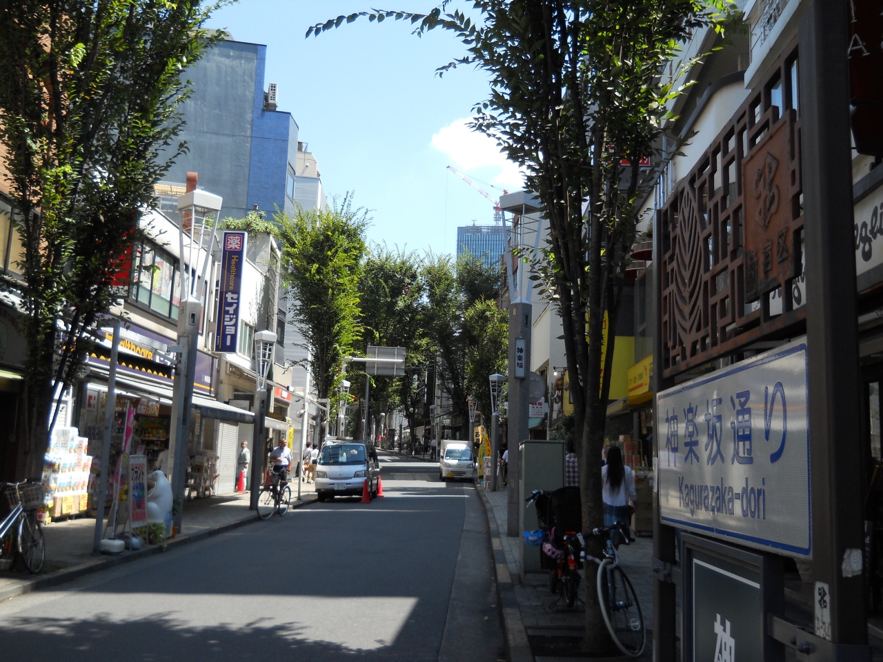 神楽坂あたりの早稲田通りは神楽坂通りと呼ばれている。外濠通りの神楽坂下から坂を登って大久保通りとの交差点が神楽坂上、更にその先の赤城神社あたりまで神楽坂と言っているようだ。その先は矢来町になる。