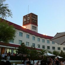 北大阪の中心の1つである千里中央にある、千里阪急ホテルのビアガーデンです。ホテルのプールサイドにテーブルといすを並べて、セルフ方式で楽しみます。