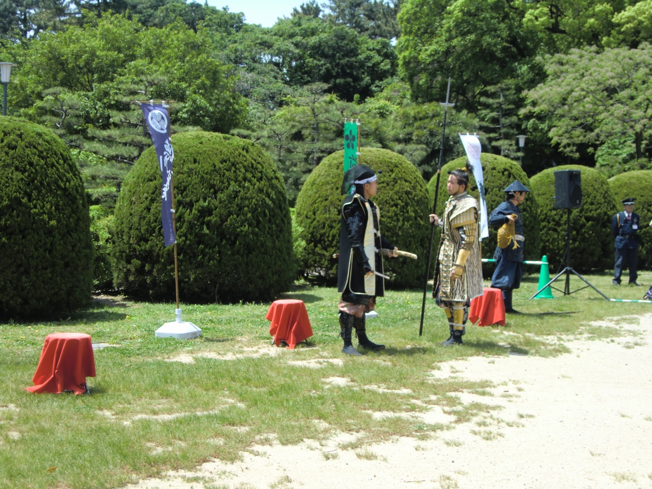 名古屋の武将隊という広告や雑誌を良く見ますが、今回初めて生で見ました。名古屋城は地下鉄の駅から徒歩で5分もあれば着きます。中は非常に広く、天守閣に行く途中の芝生の広場で名古屋武将隊のイベントをやっていました。かなり人気で驚きましたが、なかなかカッコ良かったですね。