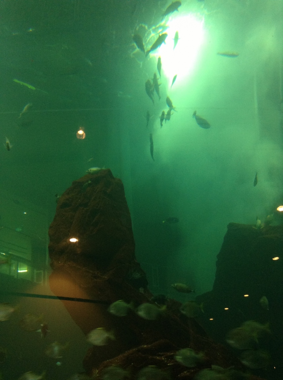 一階から二階への吹き抜けに円柱型の水槽があり、螺旋階段を登りながら、クマノミやハナダイ、ツノダシなんかがゆらゆら回遊しています。見物は無料です。