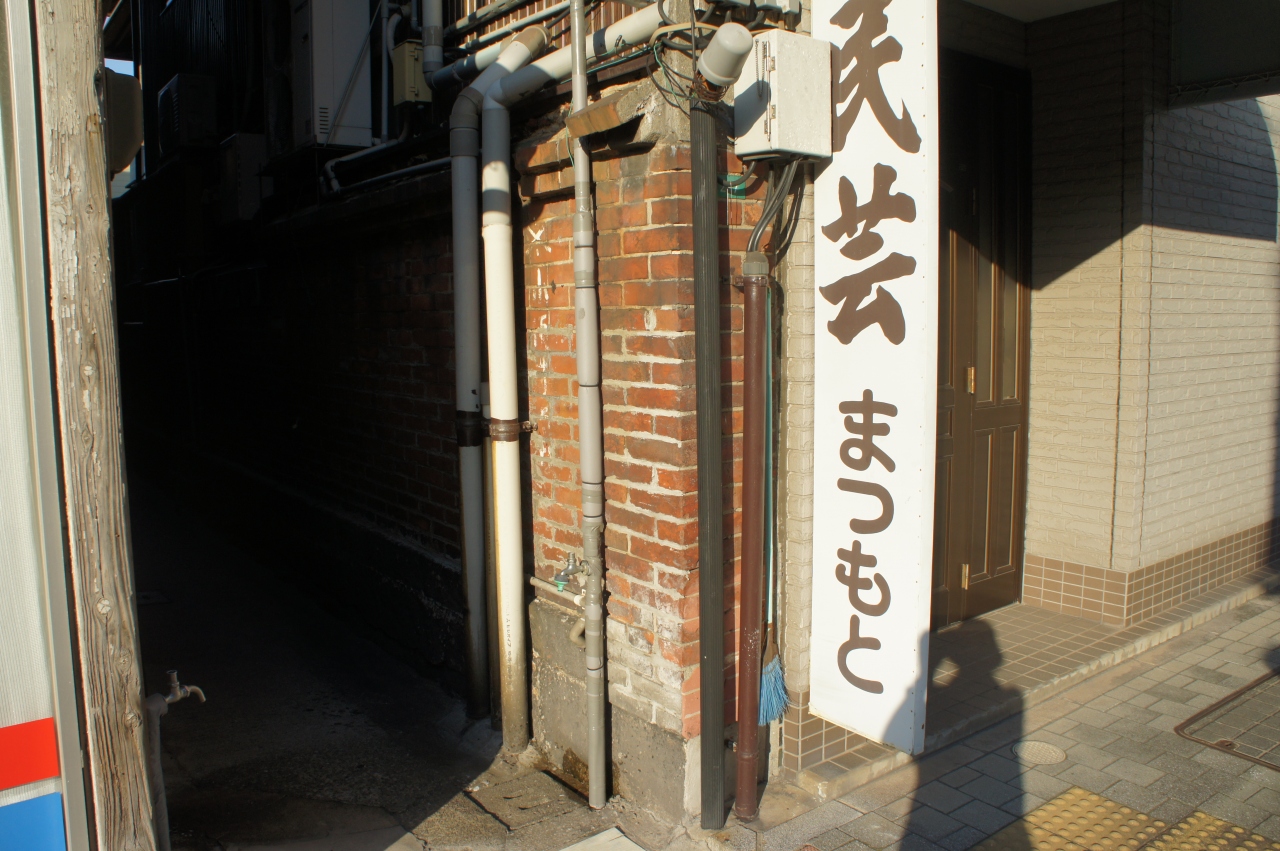 北九州の若松は、石炭の積み込みでごんぞうたちが活躍した男臭い街。当然、花街も相当に賑わっていたわけで、それが連歌町という町の跡。今では石畳が敷かれたくらいの跡しか分かりませんでしたが、住んでいる人に話を聞いたら、お茶屋があった区画は周囲から一段高く整地されていたそうです。一段高くするために積み上げたレンガの基礎が残っている場所が路地の方に残っていまして、こうした意味を教えてもらいました。