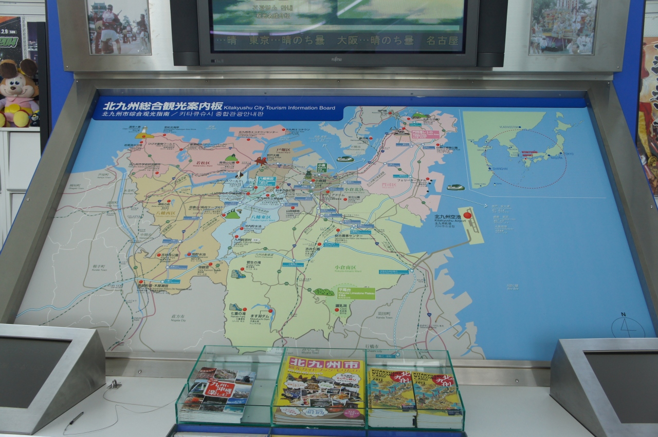 北九州空港総合観光案内所は、空港の一階。北九州の観光は、門司港レトロと小倉観光でたぶん、9割くらい。八幡・戸畑・若松といった地区の観光はかなりマイナーになると思います。そして、それらのエリアの情報も限られるので、ここのように大きな観光案内所ではないと情報収集が難しいと思います。