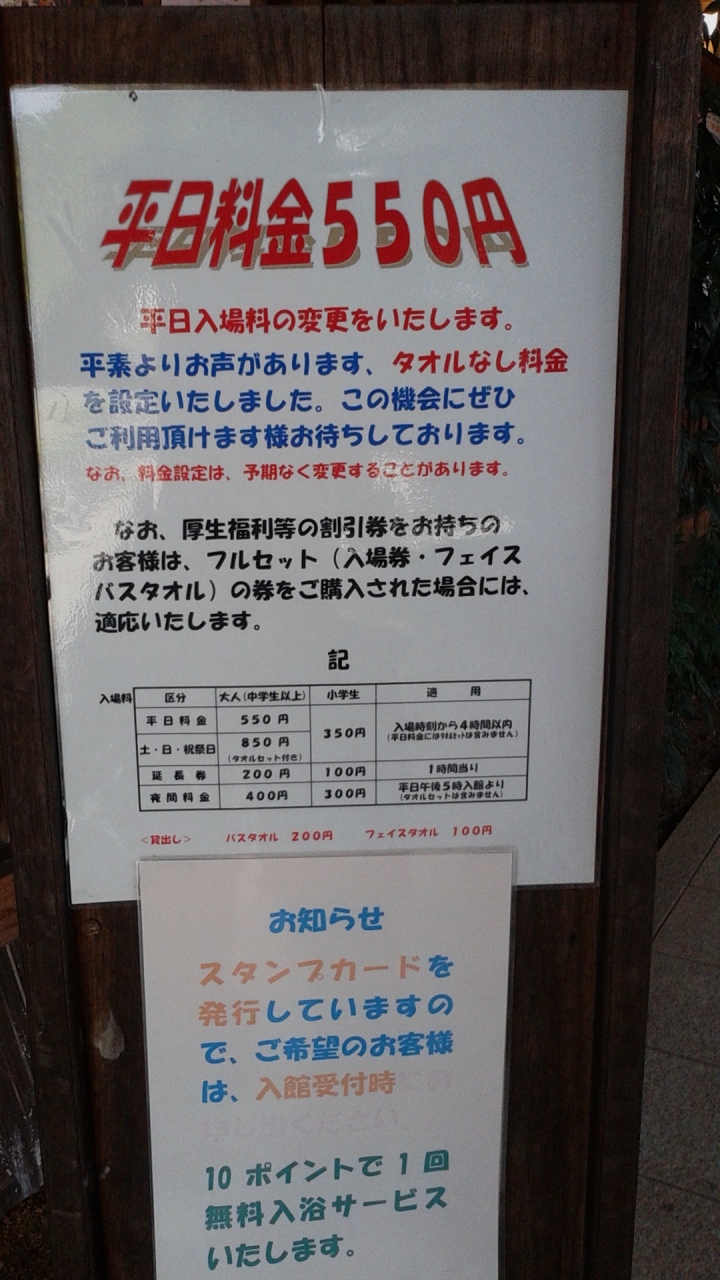 平日入館料550円(タオル、バスタオル付き850円)良心的な値段で納得。