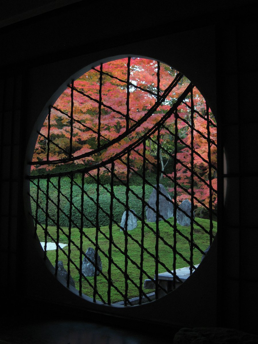 重森三玲による池泉式枯山水庭園「波心庭」は、平安式の州浜型の枯池に多数の石組が配され、方丈から眺めると緑の苔の上に配された三尊石組と背後の紅葉の見事なコントラストを楽しめました。