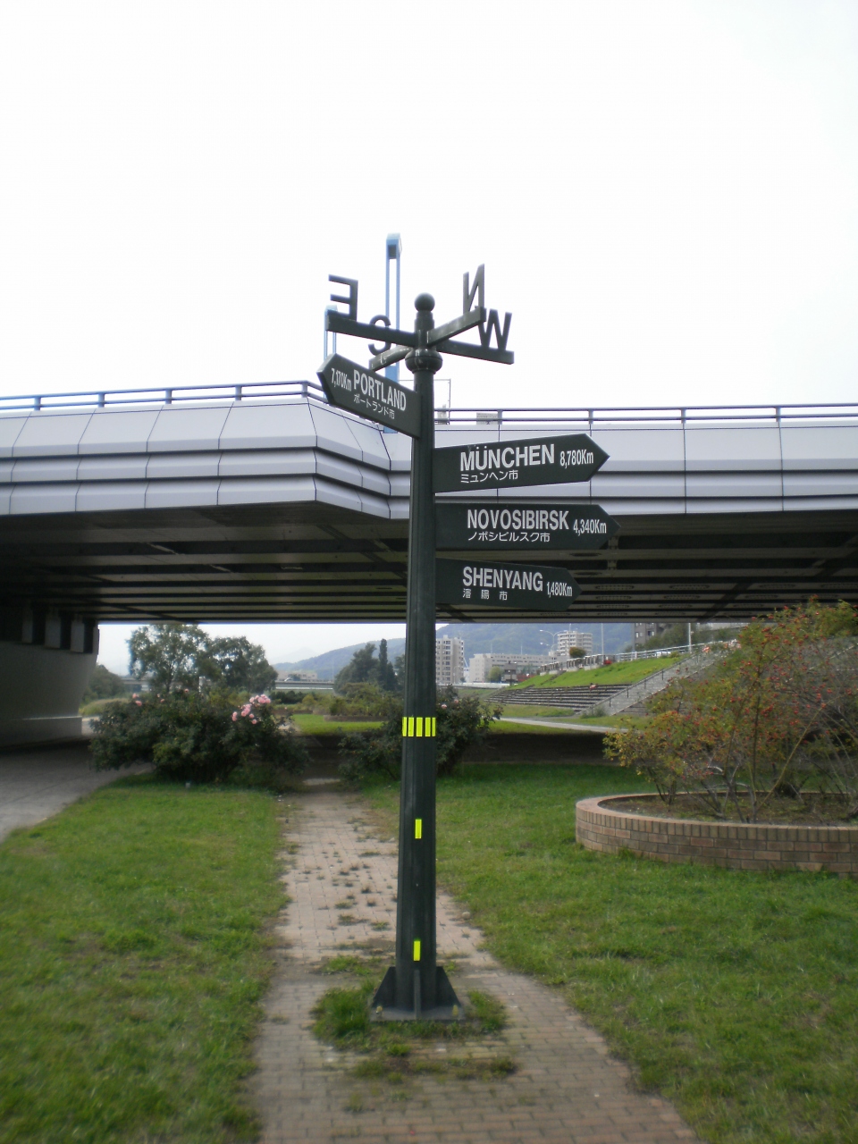 札幌の市街地を流れる豊平川にはアーチが美しい幌平橋が架かっています。 この橋には、人が上がれる展望に上がれる階段やポートランド広場などがあります。 また、橋の下の河川敷の方には、姉妹都市と札幌の方向と距離がわかるポールがたっています。