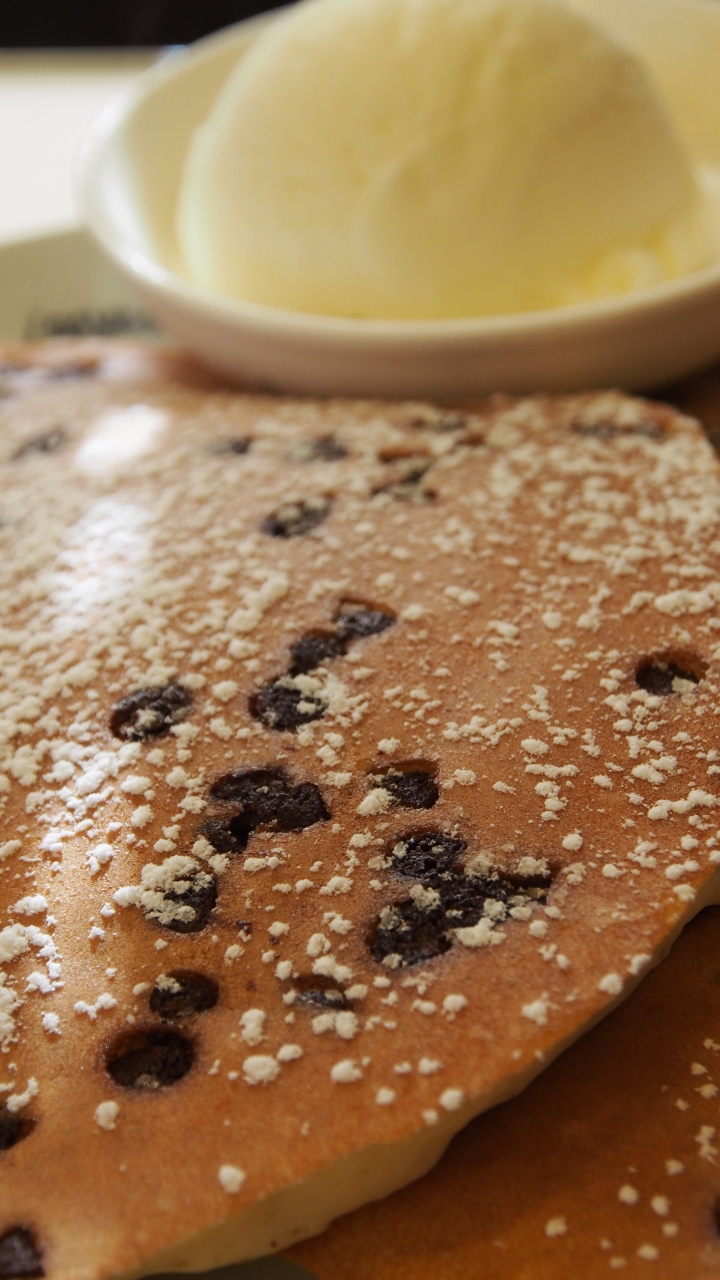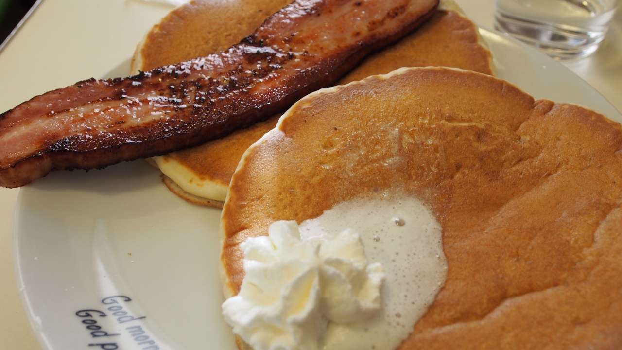 ベーコン付きのホットケーキとチョコチップ付きのホットケーキを頼みました。