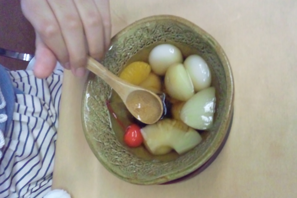 - ご年配の女性が給仕してくれる。部屋の隅に無料の果物が置いてあったりする。