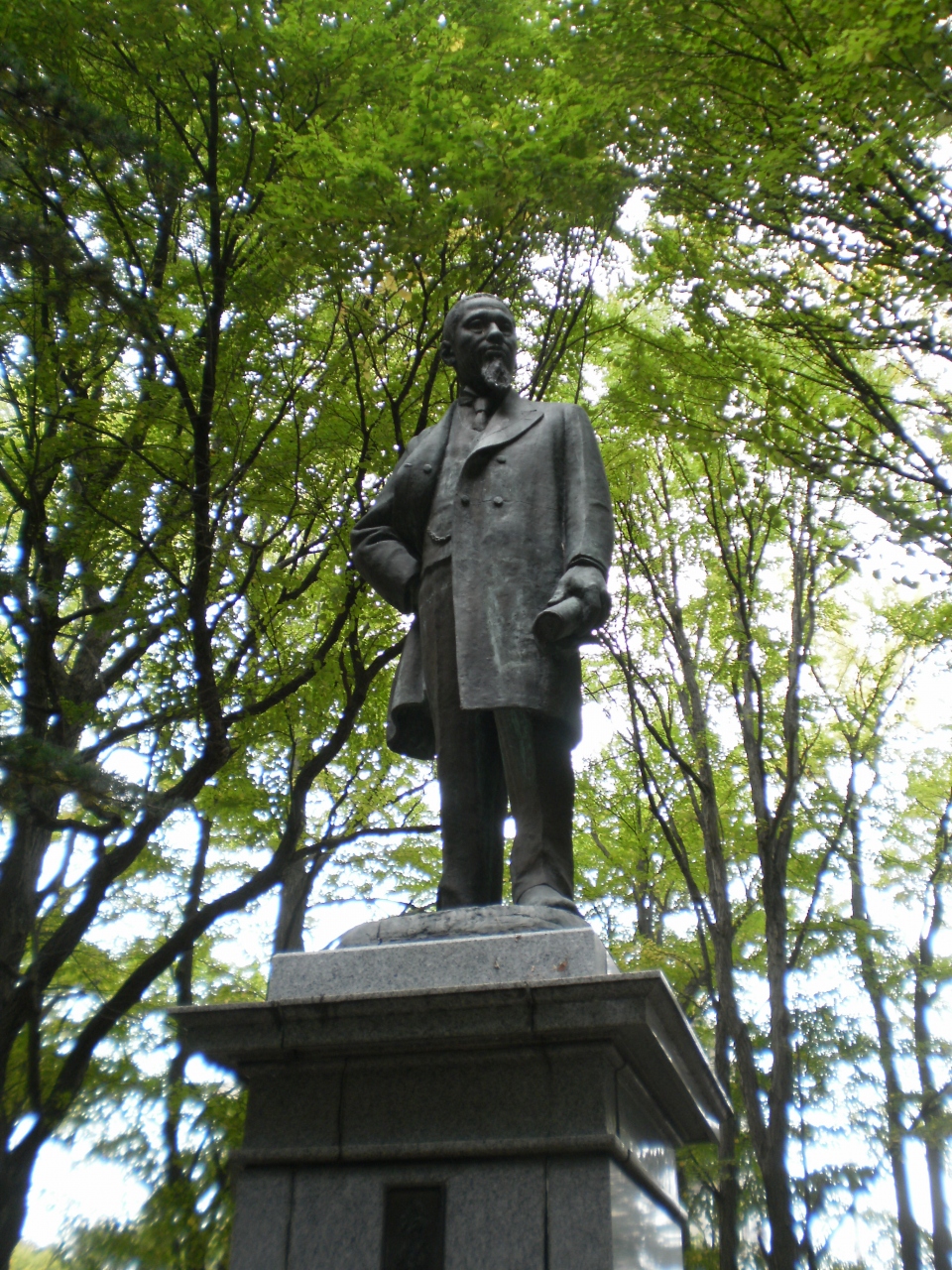 岩村通俊の立像は札幌の西のほうにある円山公園の入り口にあります。北海道神宮へ行く坂道に沿ったところです。 緑の多い園内を眺めるように立っています。 辺りは大きな樹林が多く、遊歩道も整備されていたのんびり散策するのにいいです。