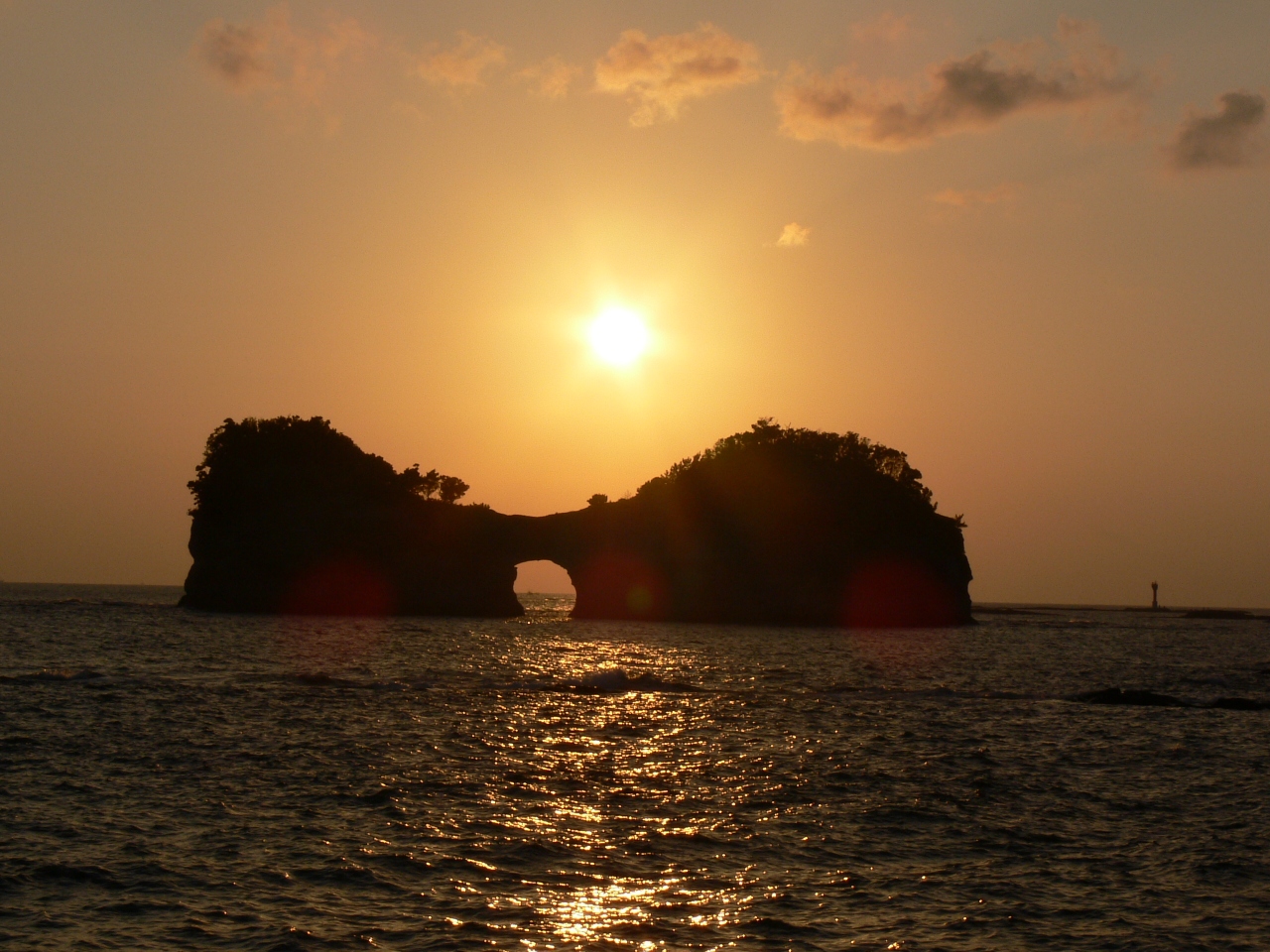 白浜の帰りに海辺に沿って走っているとちょうどいいタイミングで日没時間に合いました。写真ですとわかりにくいですがだんだんと日が沈んでゆくのがわかります。とても感動的な光景でした。でも、円月島自体も自然の美しさでした。
