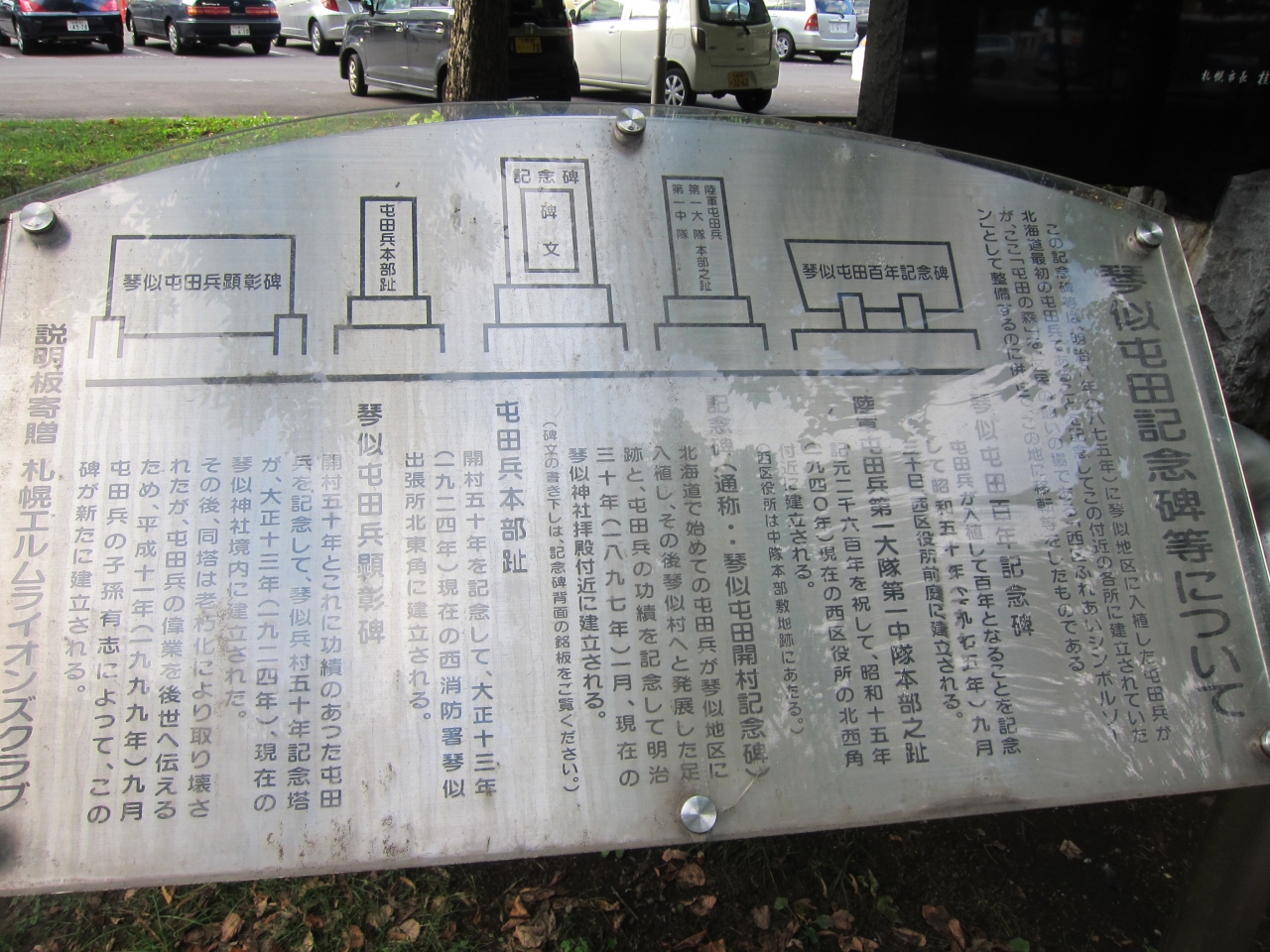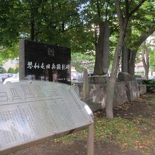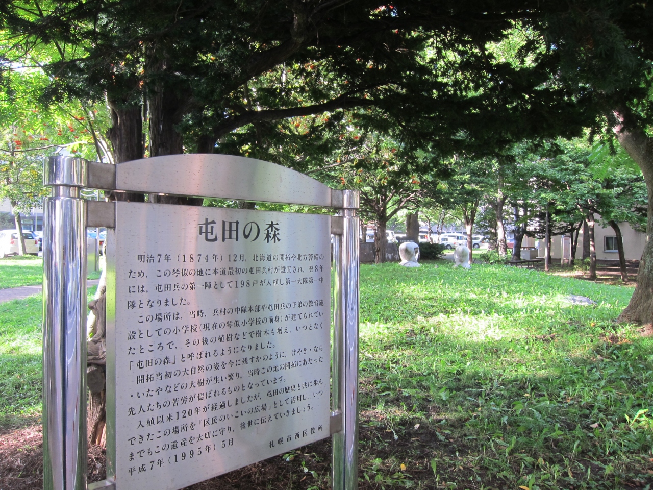 このあたり一帯は明治7年(1874年)より開拓にあたった屯田兵の入植地で、さらにこの場所は連隊中隊本部などがあった場所とのことです。石碑だけでは分かりにくいので、森の隣にある琴似屯田歴史館資料室(月・水・金の10:00-16:00)に行くとよいと思います。琴似二十四軒まちづくりセンターも入っている建物です。