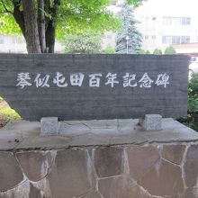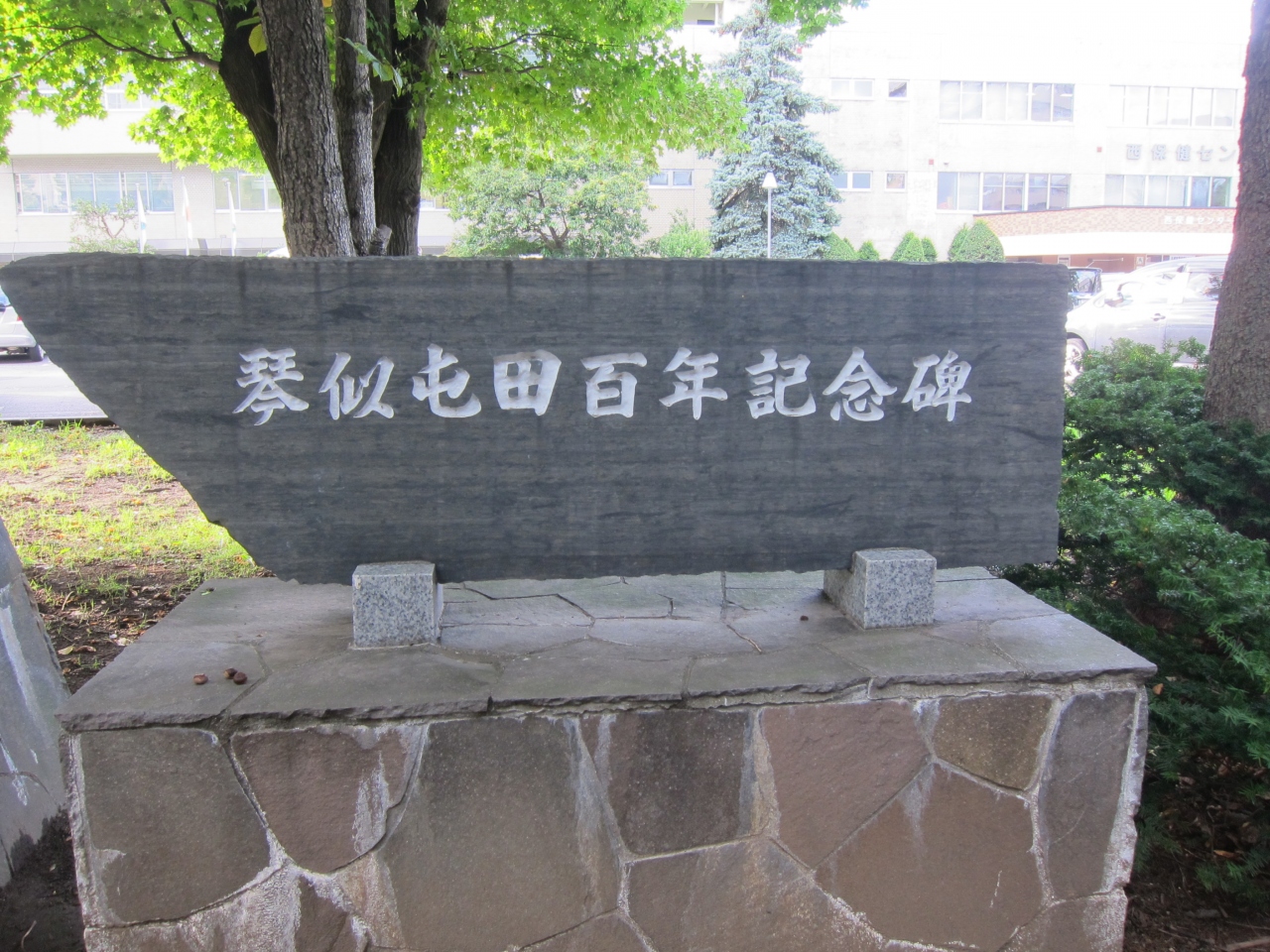 琴似栄町通り沿いの札幌西区役所前に樹林の一角があります。屯田の森です。公園として整備され、木陰の中、ベンチや庭園遊歩道が整備されていますが、その中に石碑が立ち並んでいます。屯田兵に因む顕彰碑の数々で、百年記念碑はその一番右側です。