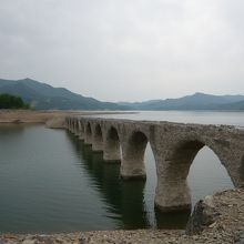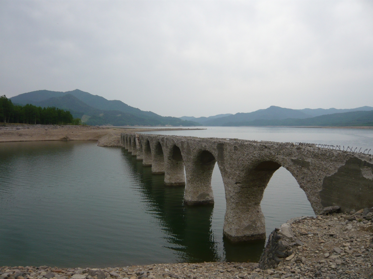十勝から上川方面に抜ける道路から林道を少し入ったところに車を止めます。そこから歩くのですがクマが出てきそうです。そして、湖が見えるとこの橋が現れます。水量の関係で沈んでしまうときもあるそうです。こんなところに列車が走っていたことに驚きです。産業遺産というのでしょうか。静かなスポットです。