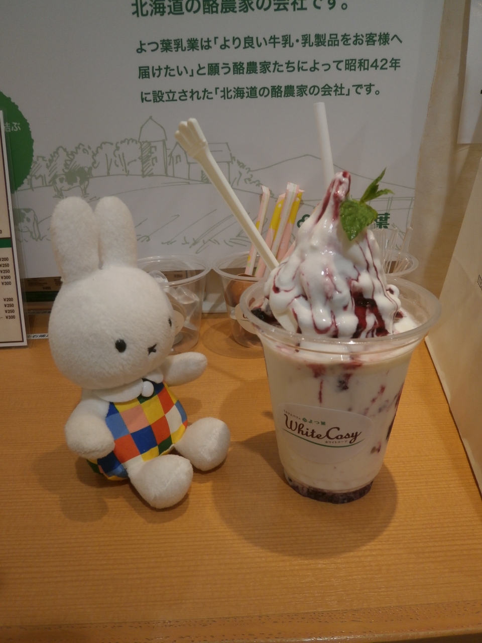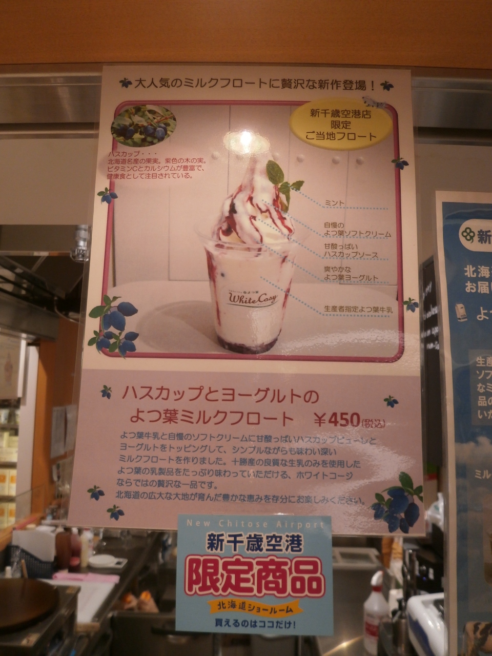 北海道の旅の〆として、よつ葉乳業の牛乳を用いたよつ葉ホワイトコージさんに来ました。新千歳空港限定である、ハスカップとヨーグルトのよつ葉ミルクフロートを頂きました。これは牛乳の上にソフトクリームをのせ、その上にさらにヨーグルトソースとハスカップソースをかけて、ミントをのせたものでした。