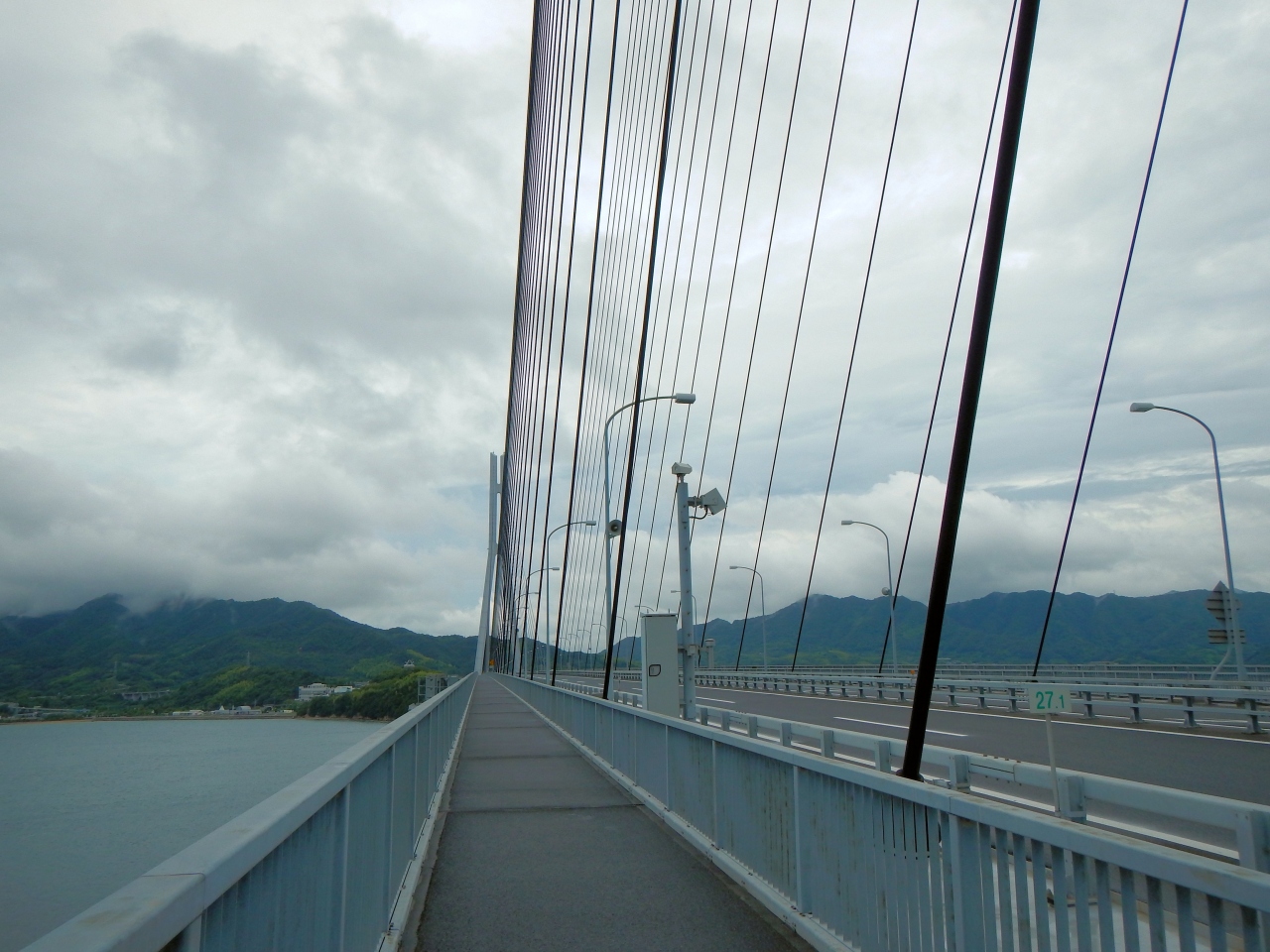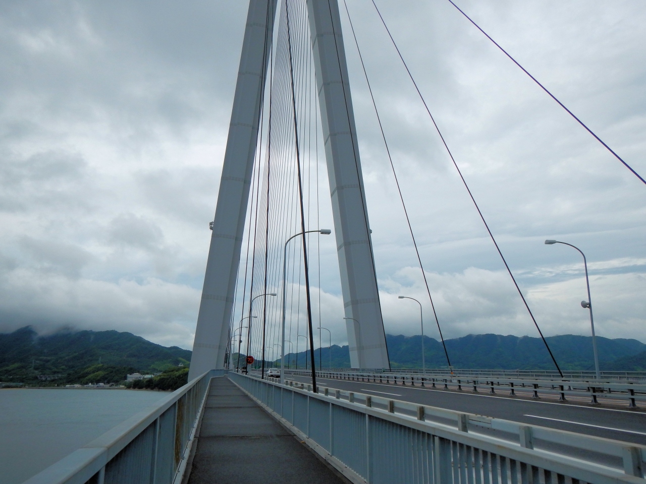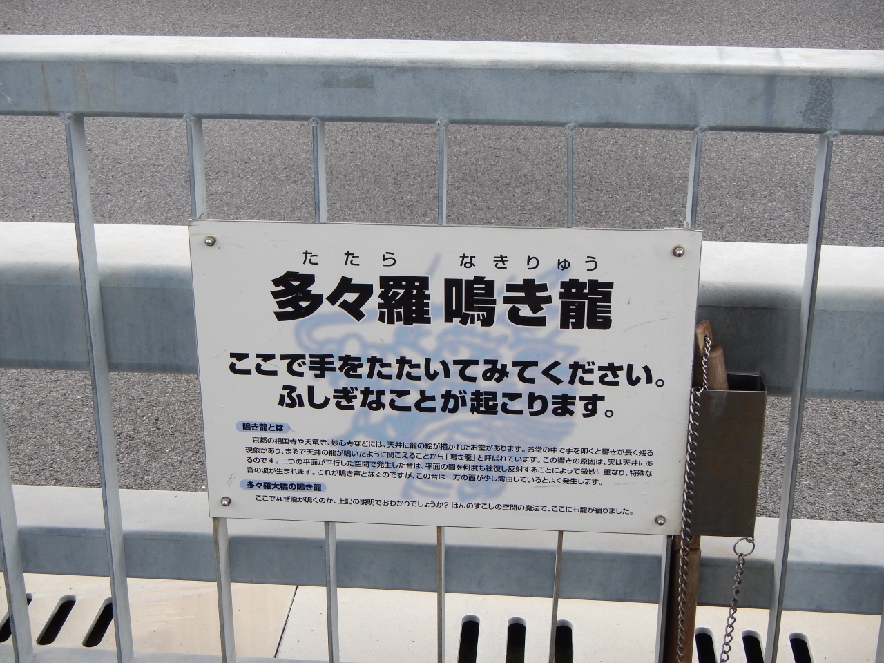 斜張橋の2本の主塔の足下に鳴き龍ポイントがあります。拍子木が置いてあって、それを叩くと音が反響します。手でやってみても同じように反響します。この鳴き龍現象は、しまなみ海道の橋では、ココだけです。自転車で走っていると通り過ぎてしまうかもしれません。注意が必要です。当然ですが、鳴き龍は、歩行者・自転車専用です。