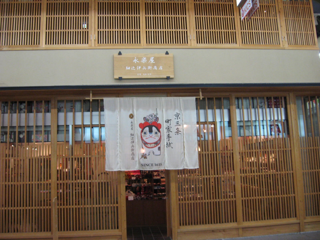 京都らしい手拭やハンカチ、風呂敷をアレンジしたバッグなどがあります。和柄とはいいものですね。アーケードのある商店街にあるので、雨の日も傘要らずです。元和元年(1615年)とあります。京都三条通りアーケード街にあります。