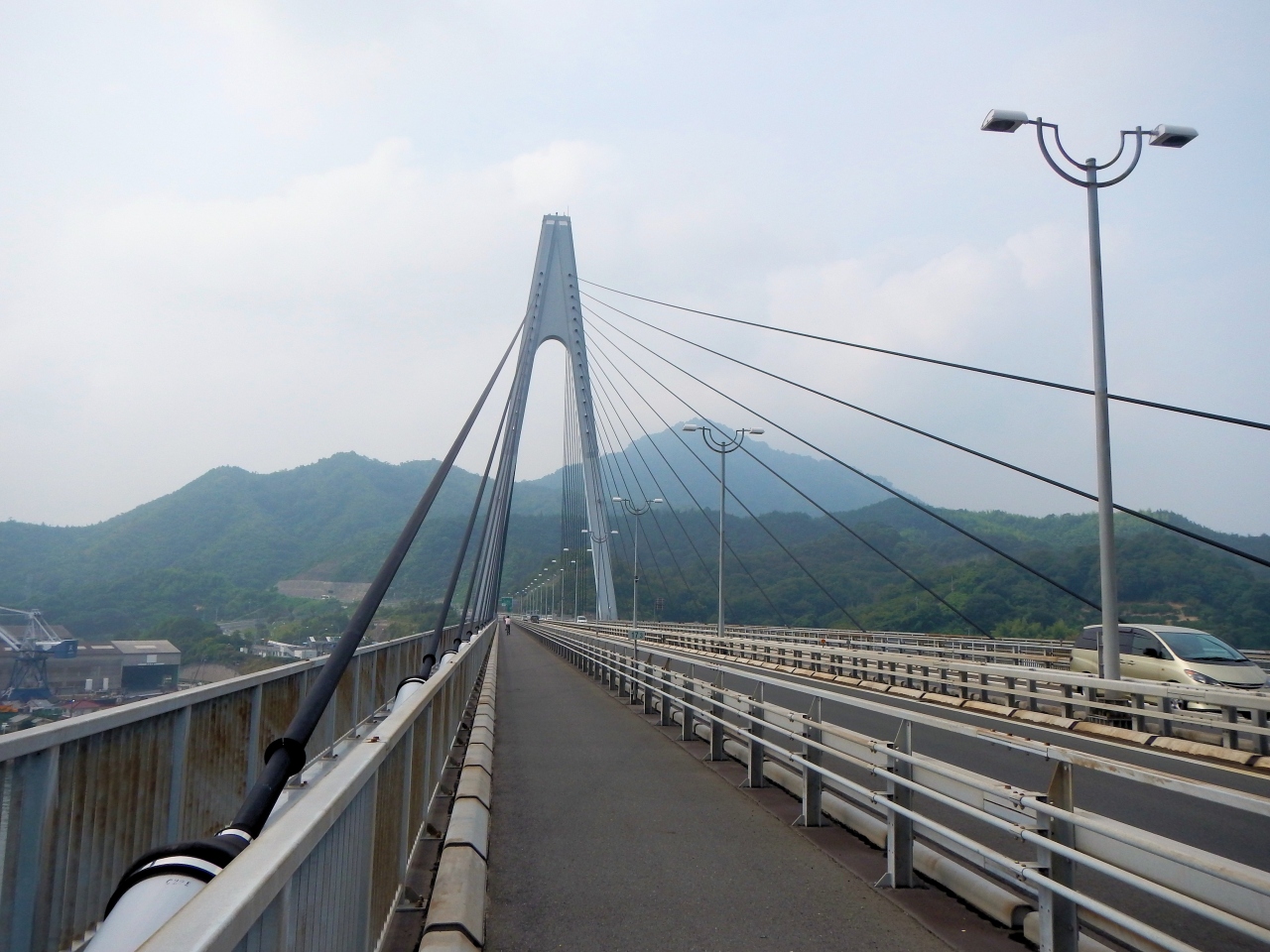 尾道方面から自転車・徒歩で来ると、最初の因島大橋は、フェンスで全く景色の楽しめないがっかり橋です。ひょっとして、しまなみ海道の橋ってみんなこんながっかり橋かという悪い予感がしましたが、この生口橋は、邪魔な構造物が無く、景色も素晴らしい橋でした。橋へののぼりは結構きついです。のぼりを避けたい時は、橋のたもとにフェリーがありますので、こちらを利用しても良いです。