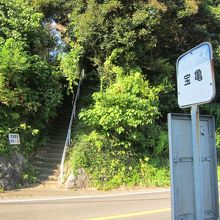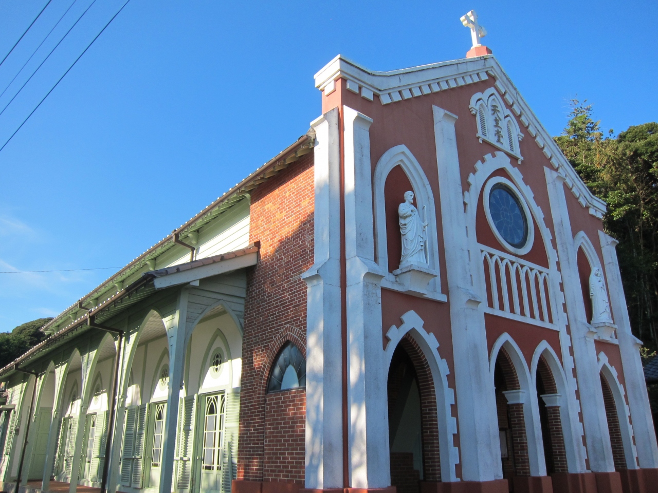 教会は平戸の中心部から10kmほど離れた宝亀地区にあります。鄙びた場所です。国道383号線にある宝亀バス停のすぐ横の細い小道を行くこと、8分とあります。多少傾斜のある道を登ります。なお、教会の前まで車で行くこともできます。高台にあるため、海と入り組んだ海岸線の眺望が教会からも少し楽しめます。