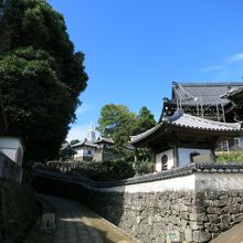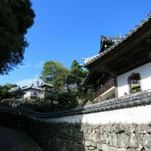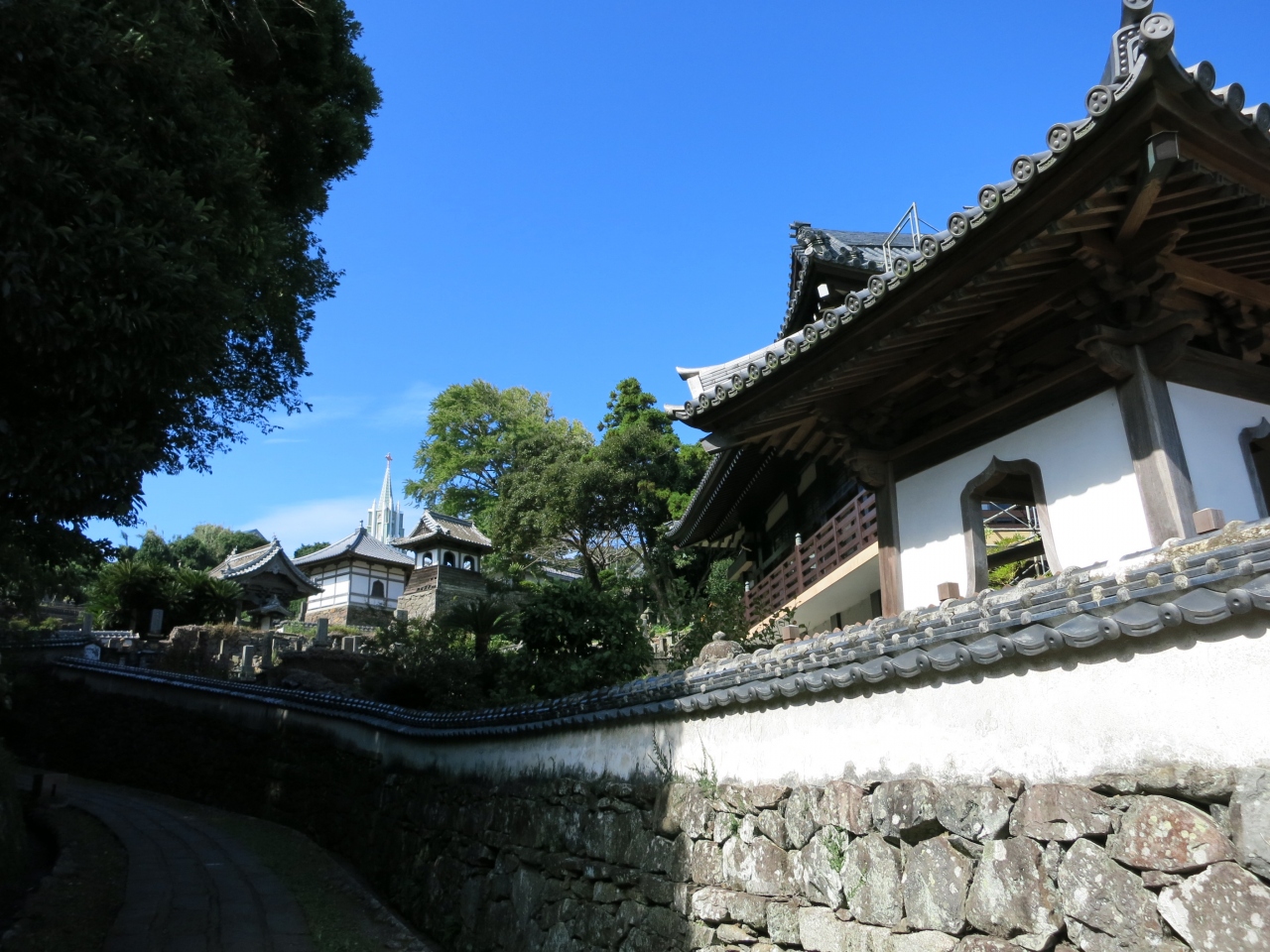坂からは途中、瑞雲禅寺や光明寺に入っていくことができます。光明寺からも寺の建物に教会が控えるアングルが眺められます。そして坂を上がりきったところには、松浦隆信(宗陽)の墓がある正宗寺があるほか、更に進むと聖フランシスコ・ザビエル教会の裏口にたどり着きます。