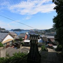 瑞雲禅寺、光明寺が並ぶ坂道の背景に聖フランシスコ・ザビエル教会の尖塔が見えます。異国情緒あふれる変わった風景です。そして振り返るとフェリーの船着場と平戸瀬戸の青い海が見えます。景色のよい場所だと思うのですが、分かりにくい細い路地を行き、階段を登らなくてはならないためか、海岸沿いの表通りに比べて観光客も少なくなります。