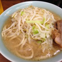 らーめん小にしましたがすごいボリュームで食べても食べても無くならない!麺が見たことのないくらい太くてすすれない。隣の人は「野菜増し」とか言ってましたが絶対食べきれないと思いました。店員さんがニンニク入れますか?と聞いてくれます。この後仕事が無ければ入れてたなぁ。次回また挑戦したいです。