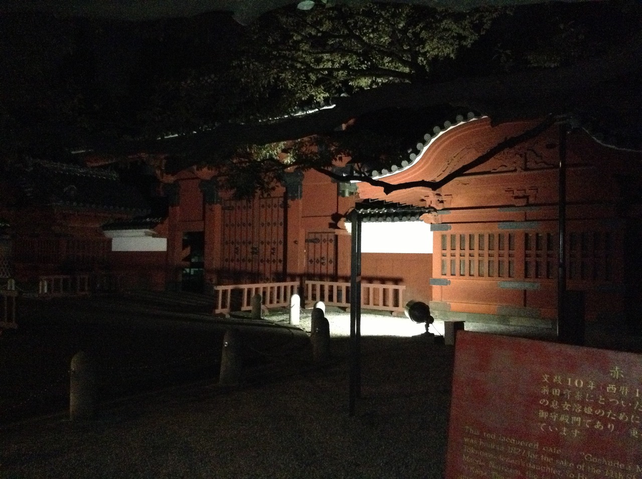 旧加賀藩主前田家上屋敷の御守殿門だった建物で、1827年に第12代藩主前田斉泰が第11代将軍徳川家斉の第21女!の溶姫を迎える際に造られました。徳川家の婚姻政策で、大名の財政を悪化させる要因となった建物の一つですね。建築様式としては薬医門であり、切妻造で、左右に唐破風造の番所を置いるのが特徴とのことです。国の重要文化財、旧国宝。