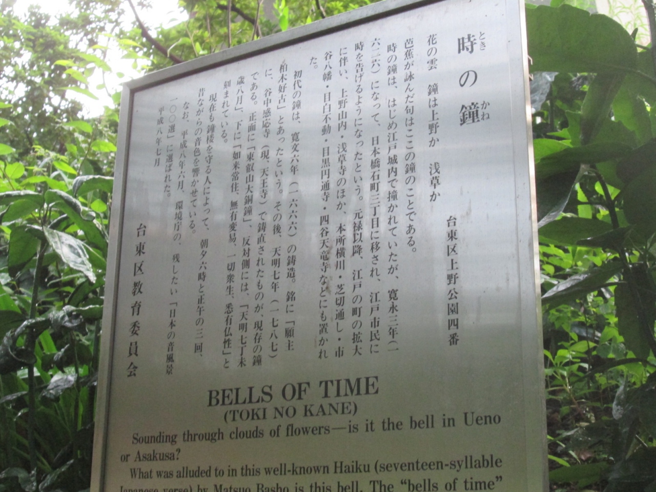 上野公園には、さまざまな碑や旧跡がありますが、そうした中でも江戸市中に時を知らせた9つの鐘の一つ「時の鐘」は、人通りの多くない「上野精養軒」横にあって、地味な存在だと思います。現在の鐘が架けられたのは1787年、徳川家斉が将軍に就任し、松平定信が寛政の改革を始めた年ですね。今も鐘の音を午前・午後6時と正午の3度効くことができます。歴史上の人物たちが聞いたかもしれない、そんな音を今も耳にすることができるのは不思議な感覚ですね。いつまでも大切に残していって欲しい江戸の情緒です。