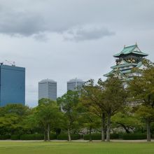 有料200円で入場しました。まず目に入るのは、一面の芝生。花見で有名のようですが、今回は時期外れです。しかし、ここから見る「大坂城」「OBP」の景色は最高、その後大坂城の周囲を一周しましたが、ここでの大坂城が一番です。落ち着いて品のある大坂城を見ることができました。