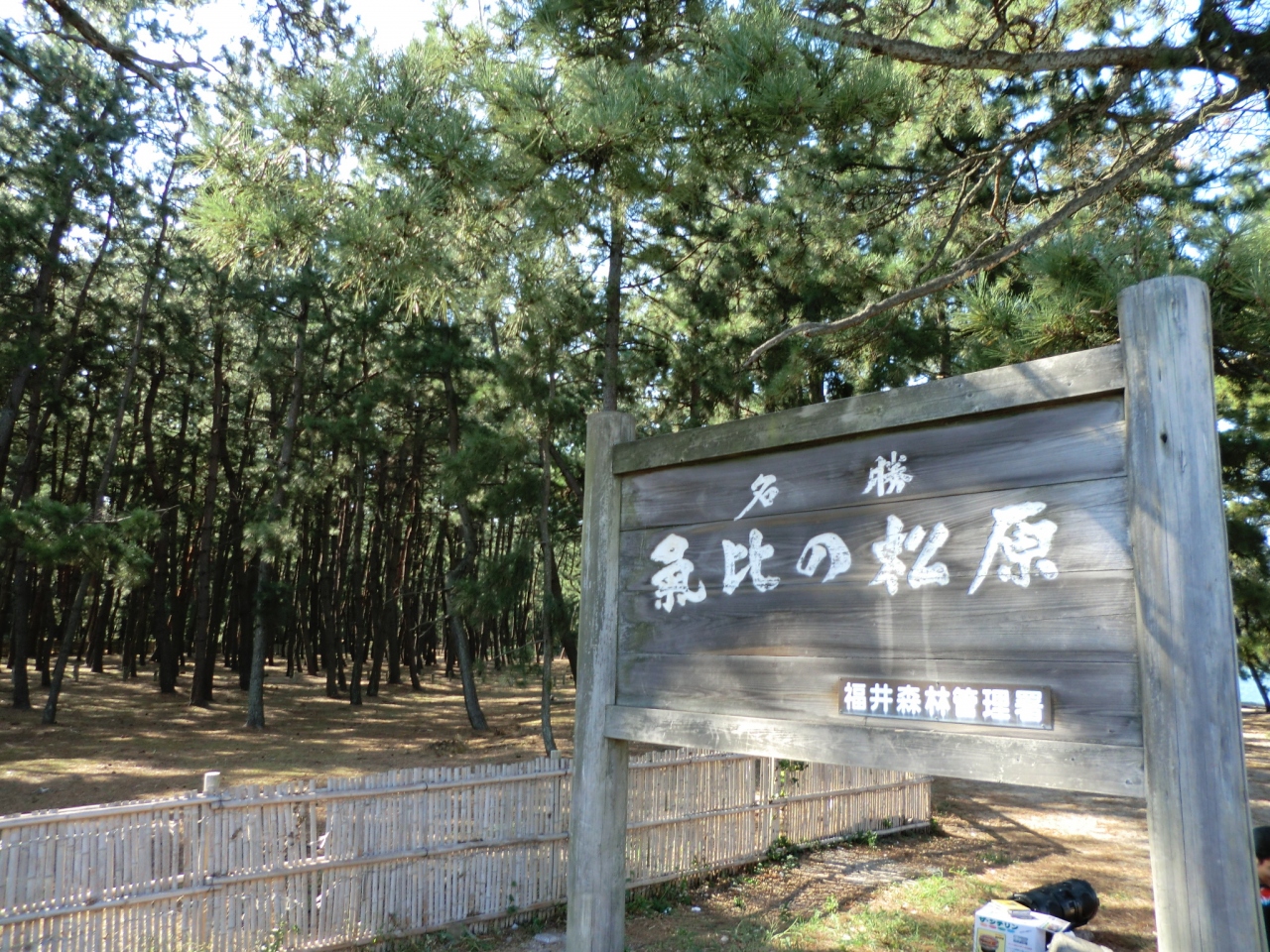 福井県の気比の松原をお勧めします。ここは松林を抜けた先に海があり、大変景色が綺麗な場所です。観光客がたくさんいました。海から投げ釣りをしている釣り人も沢山いました。ここはトンビがたくさん飛んでおり、餌をやってはいけませんとの注意看板ありました。襲われた人がいたのかもしれませんね。