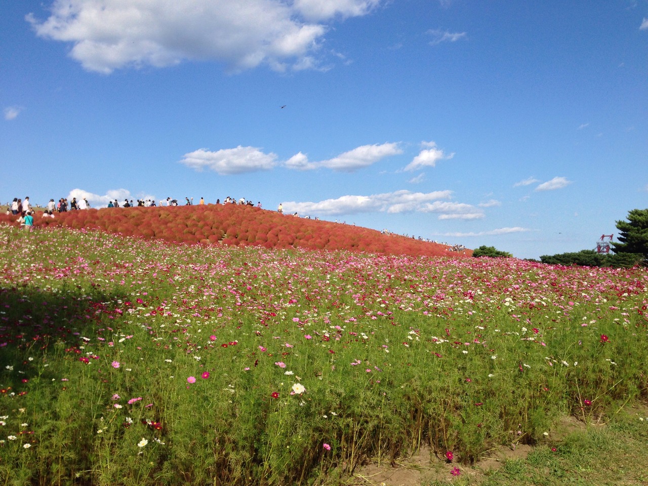 秋の名物コキアの紅葉はまだ五分の色づきでしたが、中央フラワーガーデンとみはらしの丘に広がるコスモスが満開で見事でした。特に中央フラワーガーデンのコスモスは品種ごとに植栽されていて、カカオの香りがするチョコレートコスモスや八重咲きなど珍しそうな品種を見られました。