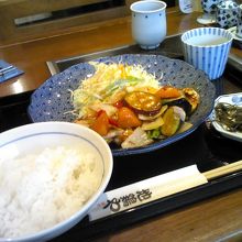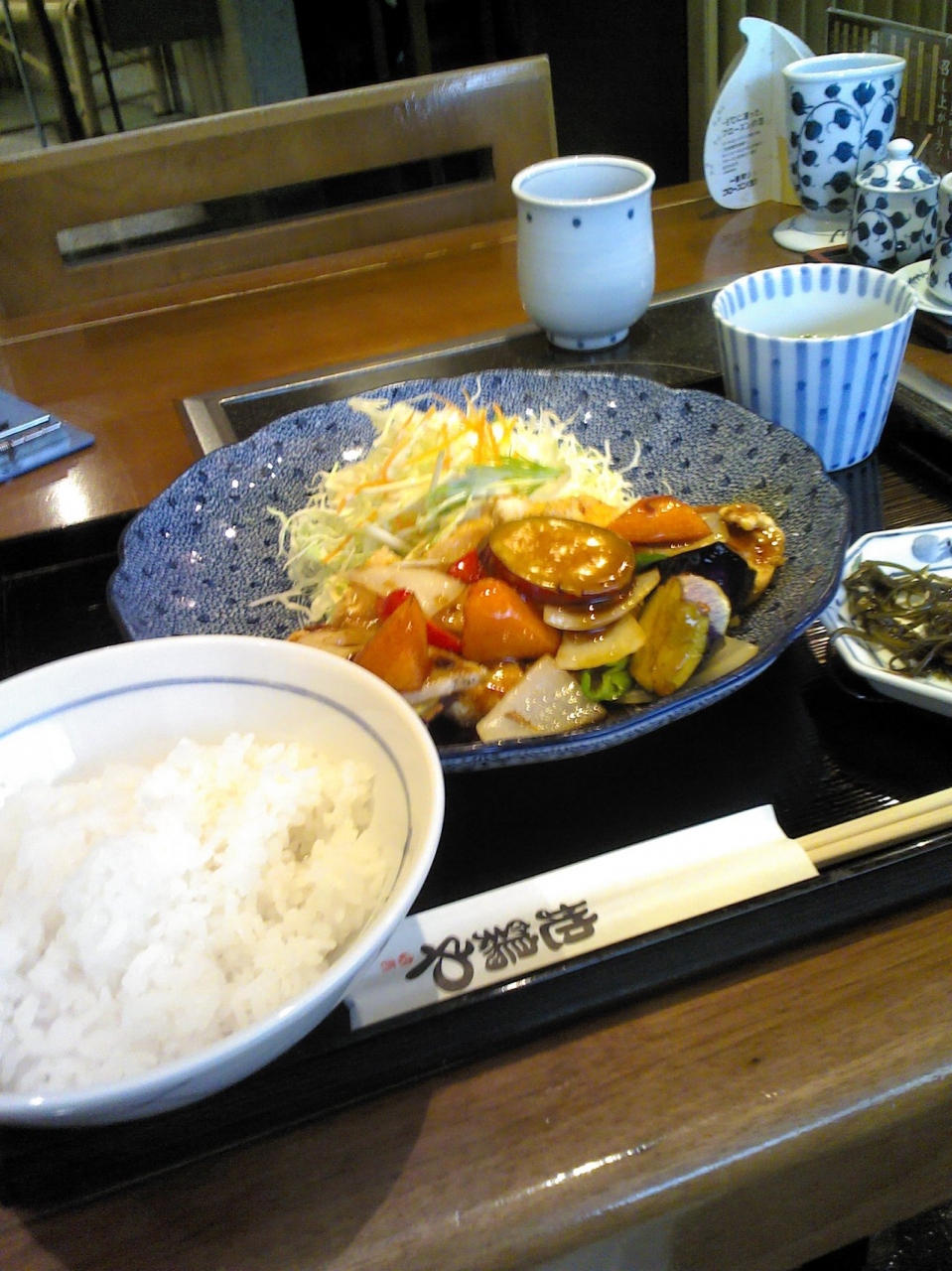 使った丼と定食です。店内は広くカウンターとテーブル席で清潔感があります。若鶏といっぱい野菜の黒酢あん定食¥1050を注文。いっぱい野菜だけあって、色んな野菜が揚げた鶏肉の上にたっぷり!でも味付けが濃くて…残念。