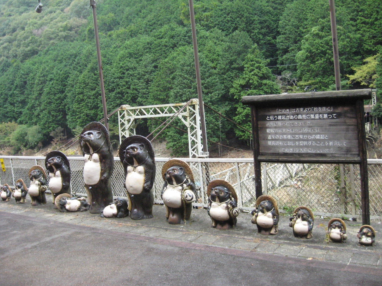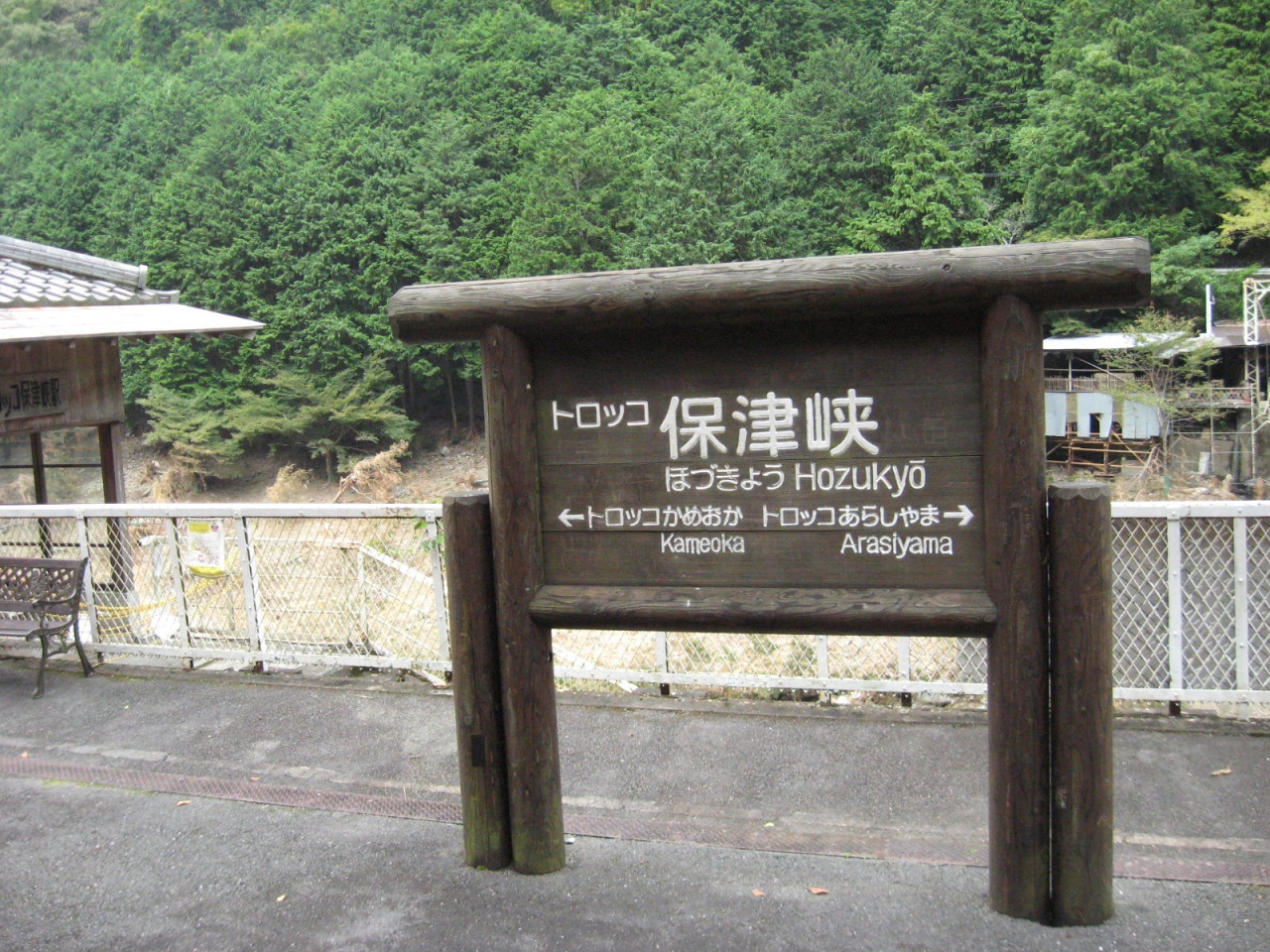 トロッコ保津峡駅では,駅のホームからは美しい保津峡を眺めることが出来ます。吊り橋がかけられていて「鵜飼橋」と呼ばれており,駅と対岸を結びます。またホームには10数体もの「タヌキの置物」や「鐘の鳴る木」があります。今回は、最近の雑炊被害の影響で「鵜飼橋」は通行禁止でした。